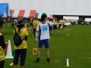 9月21日(日)に、第25回富山県障害者スポーツ大会(フライングディスク競技会)が行われ、本校より、中学部2名、高等部8名の生徒が出場しました。今大会では、5mまたは7m離れた地点からディスクを投げて、ゴールに入った回数を競うアキュラシー競技と、ディスクが飛んだ距離を競うディスタンス競技の2種目が行われました。たくさん練習に取り組み、臨んだ大会。自己新記録や目標の記録を出せた生徒も、緊張から思うような記録が出せず、くやしい思いをした生徒もいましたが、仲間と共にスポーツを楽しんだ秋の一日には、さわやかな笑顔があふれていました。