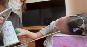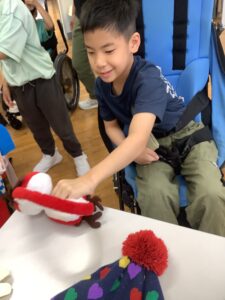 <訪問A組>訪問教育では、「いろいろな物に触れてみよう」をテーマに、手を使う学習に取り組んでいます。ペンや筆などを握って色を付けて作品を作ったり、ひもを引っ張るゲームをしたりしています。指に力を入れてぎゅっと握り続けたり、引っ張ったひもの先に付いているカードに注目したりするなど、興味をもって、意欲的に学習に取り組む姿がみられています。