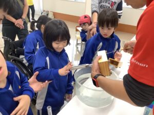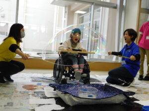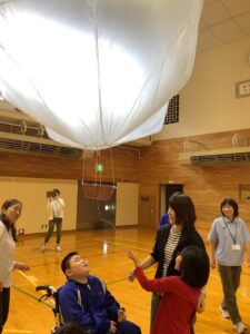 小学部の児童は三つのグループに分かれ、「音遊び」「しゃぼん玉遊び」「熱気球作り」を体験しました。
