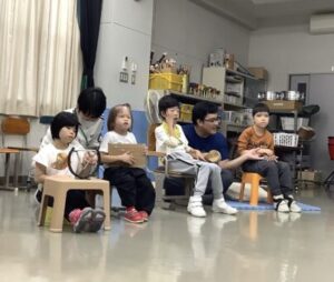 小学部D、E、F組の音楽では、「むしのこえ」を合奏をしています。前奏が始まると、顔が上がったり、笑顔になったりして曲を楽しむ様子がみられます。鈴やギロなど、「むしのこえ」に似た音色の楽器の中から好きな楽器を選び、曲に合わせて音を鳴らして演奏を楽しんでいます。