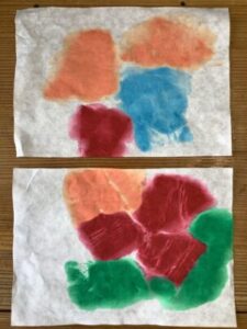 小学部D組の図画工作では、「カラータック版画をしよう」に取り組んでいます。好きな色のカラーシールを選び、はさみで切ったり、破いたりして三角や四角などの色々な形を作り、台紙に貼ることで版を作りました。版の上に置いた刷り紙に霧吹きで刷り紙に水を掛けて、ばれんで繰り返しこすって版画作品を作りました。一人一人の刷り紙に色鮮やかな模様が写った素敵な作品ができました。