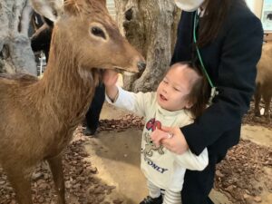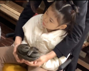 剝製に触れたり、本物の毛皮を見比べたりして自然の生き物について学習してきました。大きな熊や猪の剥製を見たときは、初めは緊張した様子でしたが、気に入った手触りの動物を見付けると、手をよく動かしたり、剝製に近付いて観察したりする姿がみられました。また、生きた蛇や蛙を手に乗せる体験も行いました。生活単元学習で生き物との触れ合い方を学んでいたことから、生き物に対して優しく接することができました。