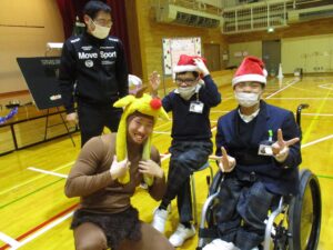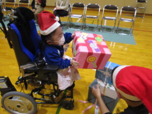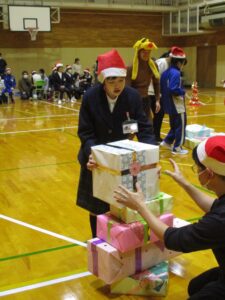 最後に、寄宿舎生は職員がふんしたサンタクロースとトナカイから一足早いクリスマスプレゼントをもらい、楽しい時間を過ごしました。