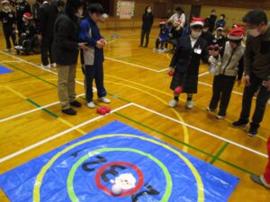 ゲーム「ころがせ★クリスマスボール」では運動会の的入れの要領で的に向かってボールを転がし、チームで得点を競いました。高得点の中心にボールが止まったときには「やったー」などの歓声が上がりました。「ドキドキプレゼントタワー」では、チーム対抗でプレゼントの箱を運んで積み上げました。どんどん積み上がっていくプレゼントを倒さないように、ゆっくり、そっとプレゼントを置いて、どちらのチームも素敵なプレゼントタワーが出来上がりました。