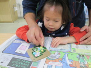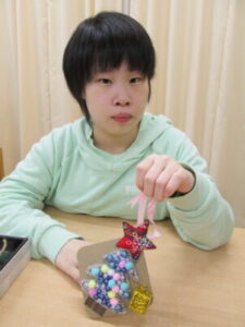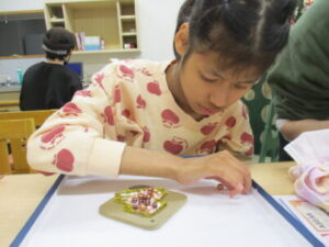 12月8日(月)に実施するクリスマスお楽しみ会の会場に装飾をするために、クリスマスオーナメント作りをしました。自分の好きなビーズの色を選び、もみの木の形の中にビーズを貼り付けました。色とりどりのビーズがキラキラと輝いて素敵なオーナメントになりました。