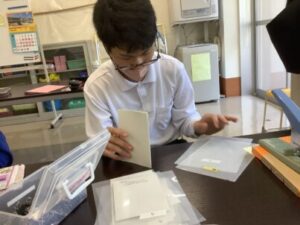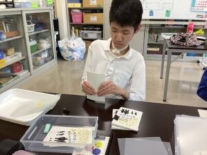 ワークトレーニング班では、メモ帳作りをしています。使いやすいメモ帳にしようと学習発表会でアンケートをとって意見を聞いたり、みんなで話し合いをしたりしながら、偉人の名言を調べてページに添えるなど、元気の出る商品を自分達で考え、お客様に満足していただける商品になるように取り組んでいます。